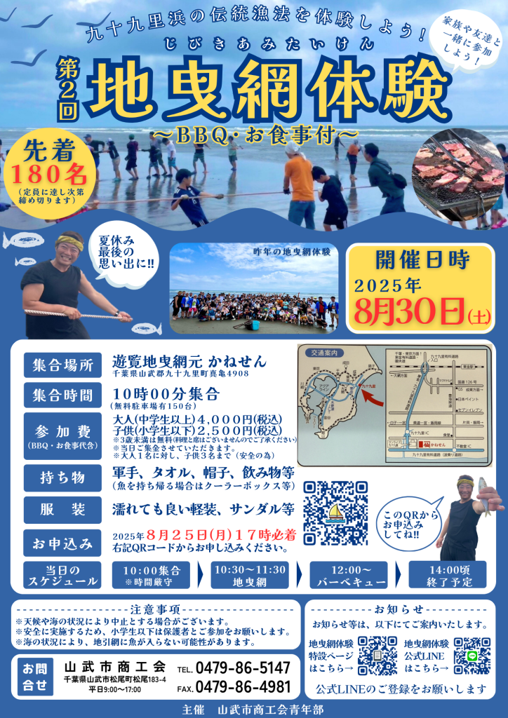 九十九里町の隣の山武市商工会青年部様が、「第2回地曳網体験~BBQ・お食事付~」を開催されます。