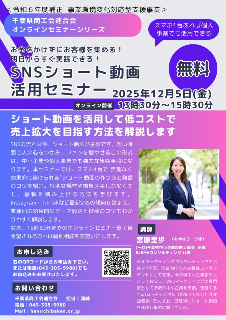 12月5日(金)「お金をかけずにお客様を集める!明日からすぐ実践できる!SNSショート動画活用セミナー」