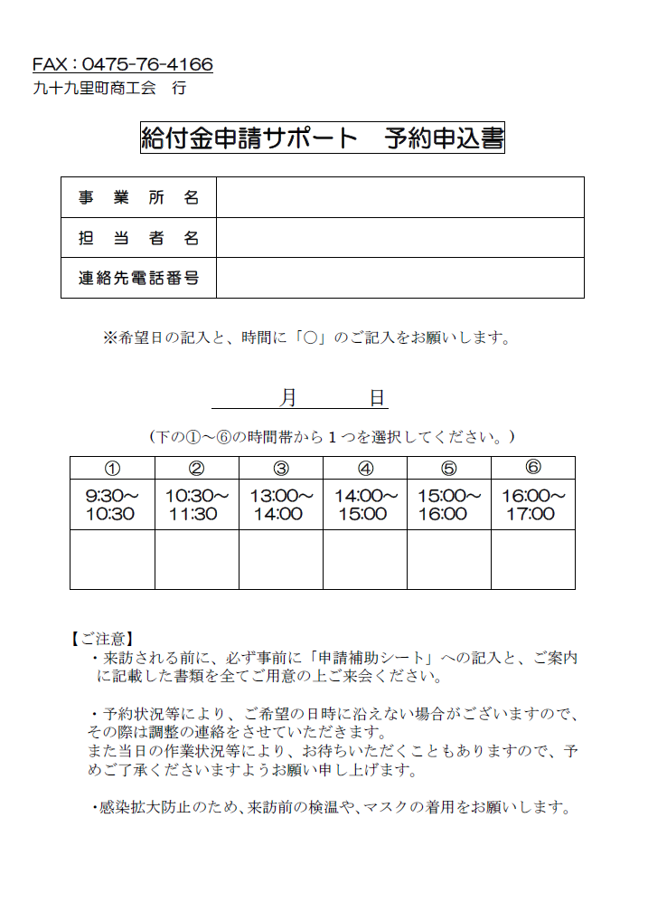 持続化給付金申請サポート窓口開設のおしらせ 最終更新日:2020年07月02日 国が実施している「持続化給付金」は、「電子申請」となっているため、ご自身では手続きが困難な事業者を対象に、商工会でサポートしながら電子申請できるよう独自のサポート窓口を開設します。感染拡大防止のため予約制となっておりますので、申請サポートが必要な方は、商工会にお申込み、お問い合わせください。(メールでも予約可能です。) 九十九里町「テイクアウト&デリバリー情報」が発行されました。 新型コロナウイルス支援策 家賃支援給付金のご案内