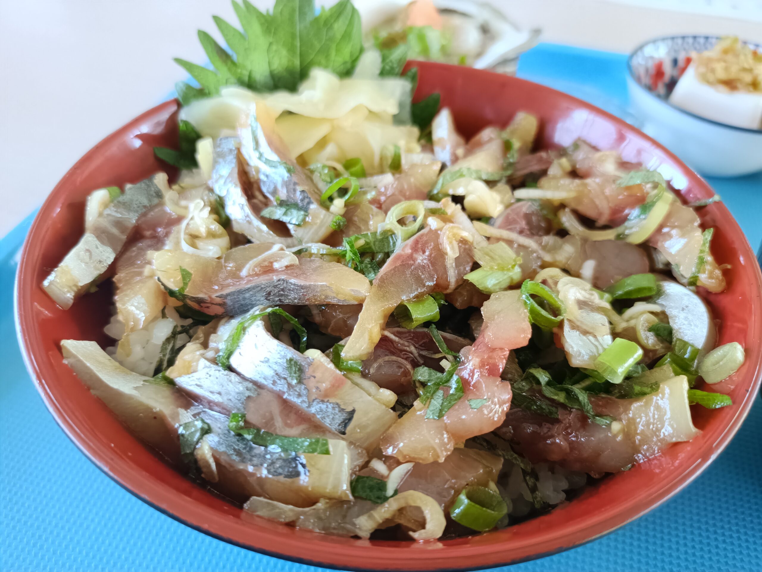 新鮮な鯵を大葉・ネギ・海苔の薬味と一緒に特製のタレに漬け込み、ご飯といっしょに食べる鯵の漬け丼。