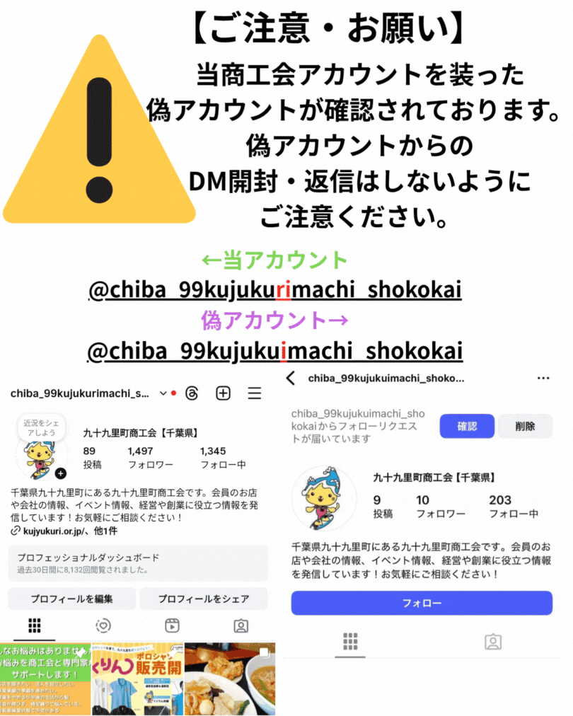 10月19日から九十九里町商工会が運営する、インスタグラムアカウントを装った偽アカウントの存在が確認されております。