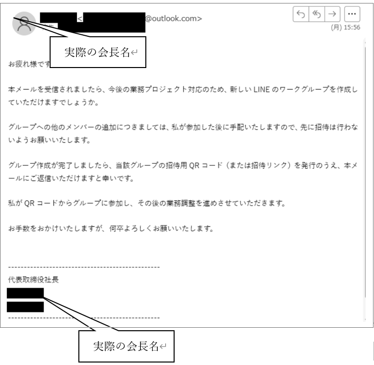 これは「ビジネスメール詐欺」の手口の1つで、攻撃者が実際の取引先や自社の経営者層等になりすまし、メールやLINEを使って振込先口座の変更を指示するなどして、攻撃者が指定する銀行口座へお金を振り込ませようとします。